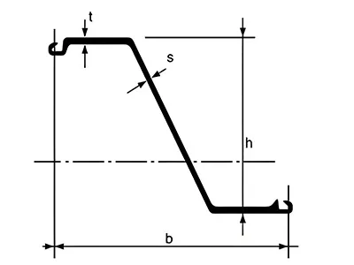 | Size (Width×Height) | Width (mm) | Height (mm) | Thickness (mm) | Thickness (mm) | Plastic section modulus (cm3/m) | Weight (kg/m) | Inertia moment Ix (cm4) | Elastic section modulus (cm3/m) |